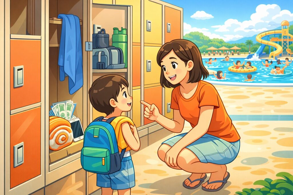 荷物はできるだけコンパクトにまとめておくと、移動やロッカーの出し入れがとても楽になります。特にプールでは移動が多くなるため、身軽さはとても大切です。