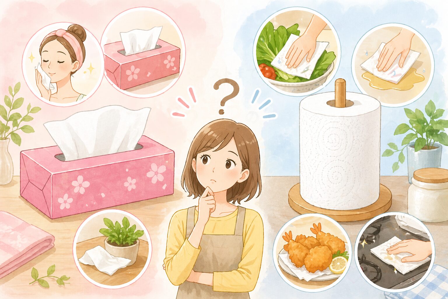 「肌に使うならティッシュ」「掃除やキッチンならキッチンペーパー」と覚えておけば安心です。