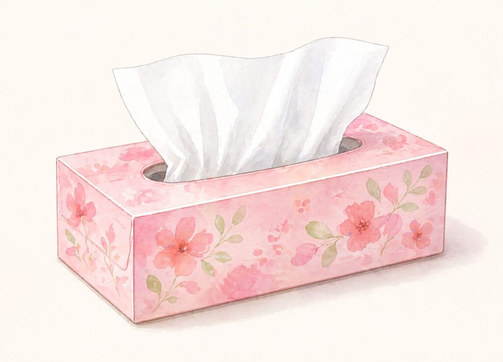 ティッシュは、鼻をかんだり顔を拭いたりするために作られているので、とてもやわらかいのが特徴です。ふんわりとした手触りで、デリケートな肌に触れても負担が少ないように工夫されています。花粉の季節や風邪のときなど、何度も使う場面でも安心して使えるように設計されています。